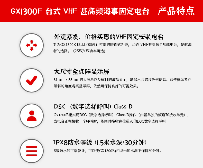 外觀緊湊,價格實惠的VHF固定安裝電臺 大尺寸全點陣顯示屏 DSC(數字選擇呼叫)緊急狀態使用,Class D IPX8防水等級(1.5米水深/30分鐘)